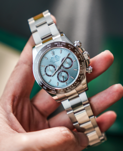 アイスブルーダイヤルの爽やかな発色、シャープな輝きを放つ新型ベゼル、操作感に優れたCal.4131クローンムーブメント、そしてプラチナのような光沢を誇るケースとブレスレット――まさに理想の一本です。
