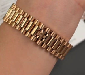 ベルト:半円形の3列リンクのプレジデントブレスレットは18Kローズゴールドコーティングされた904Lステンレススチールで作られており、DLCスクラッチプロテクションコーティングが施されています。しっかりとしたネジ山で簡単にベルト調整が可能です。また、コンシールド・クラウン・クラスプを備え、素早く快適にベルトを装着できることを確保しています。