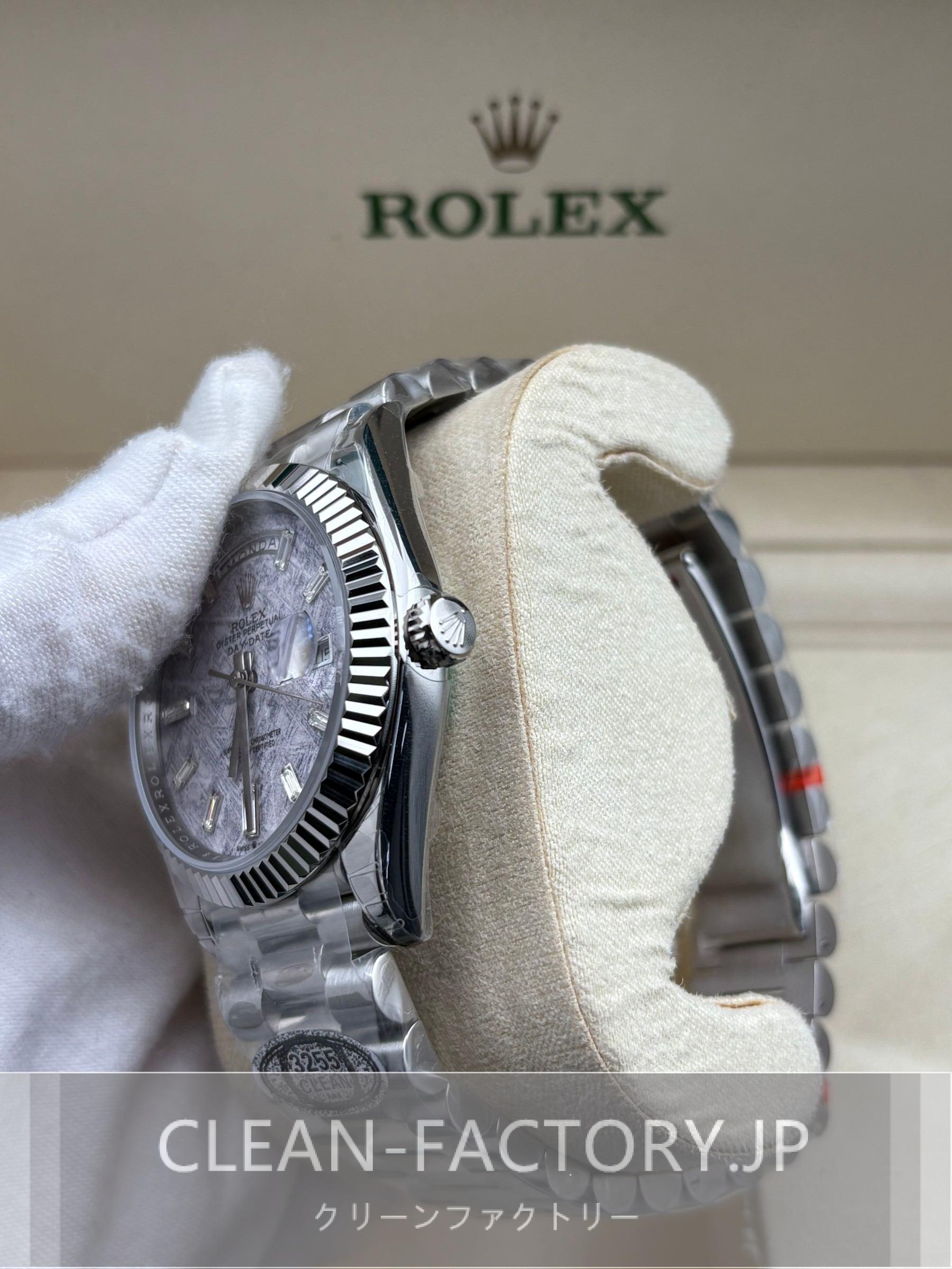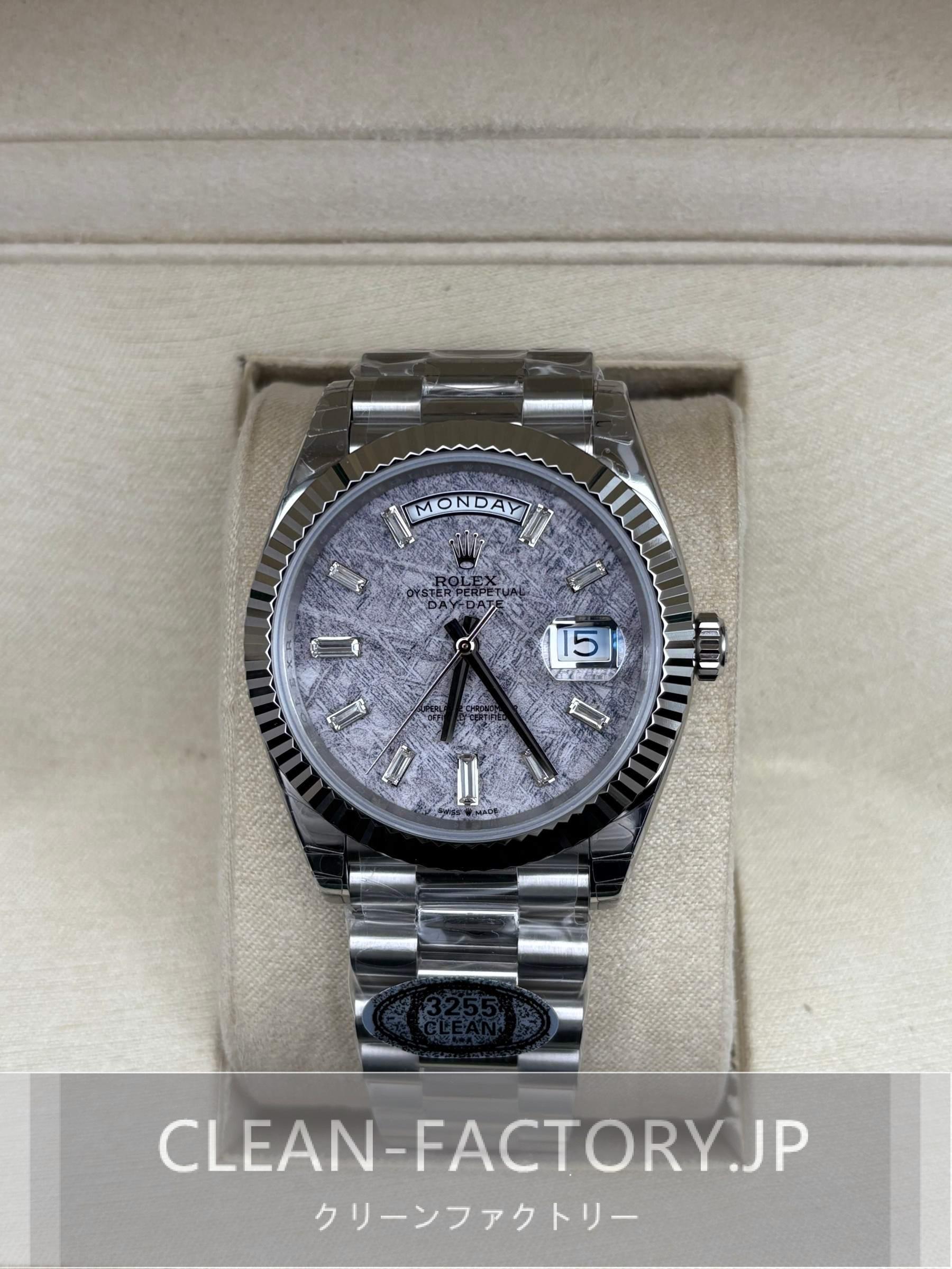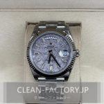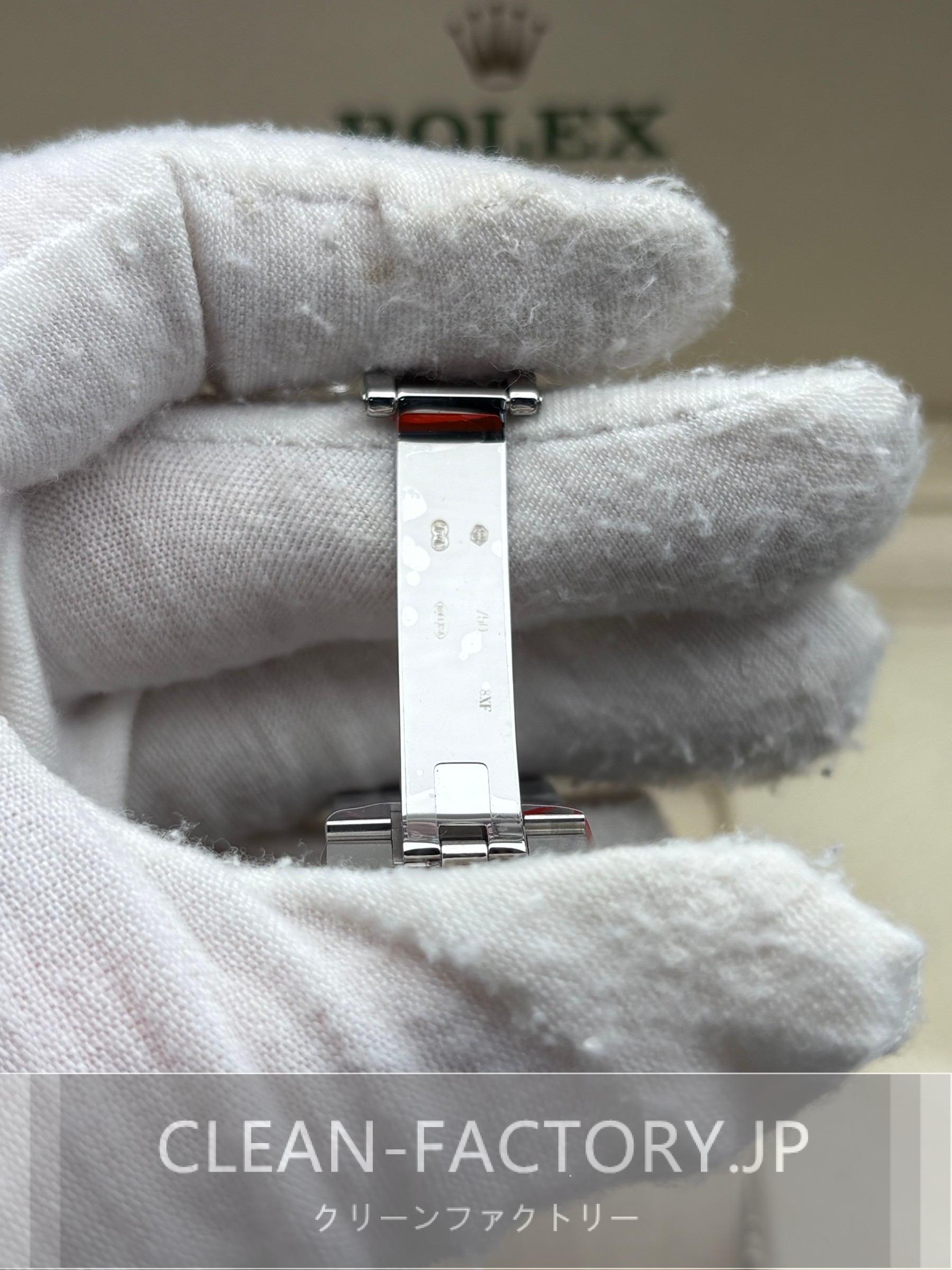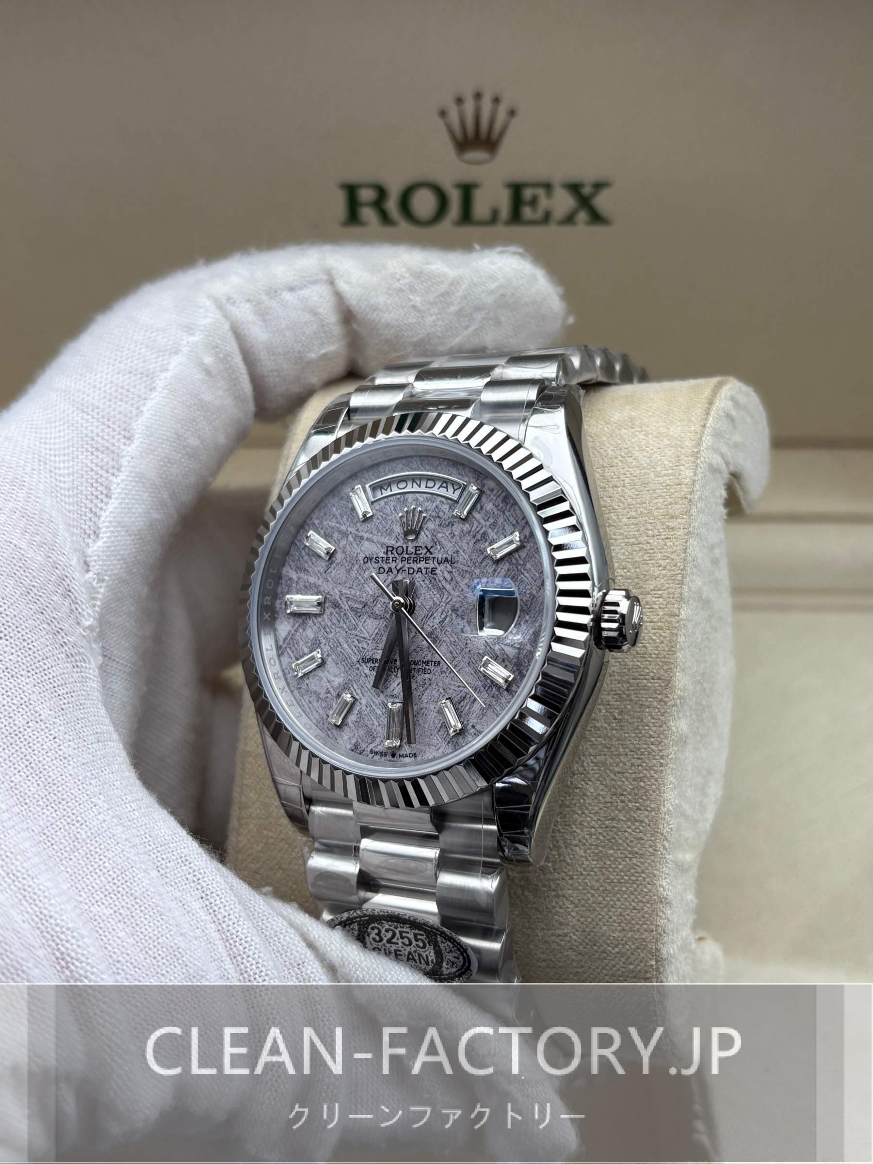 文字盤:クリーンファクトリーの文字盤は、本物の鉄隕石素材を使用しており、一つ一つに独自のテクスチャが表現されています。レーザーで精密に作られたテキスト、印刷、彫刻が施された文字盤は、本物のロレックスと見分けがつきません。また、日付のフォントやサイズもクリーンファクトリーの精密な技術で再現され、18Kホワイトゴールドコーティングされたアワーマーカーや針は、優雅さを保ちながら色あせを防ぐことに注力しています。