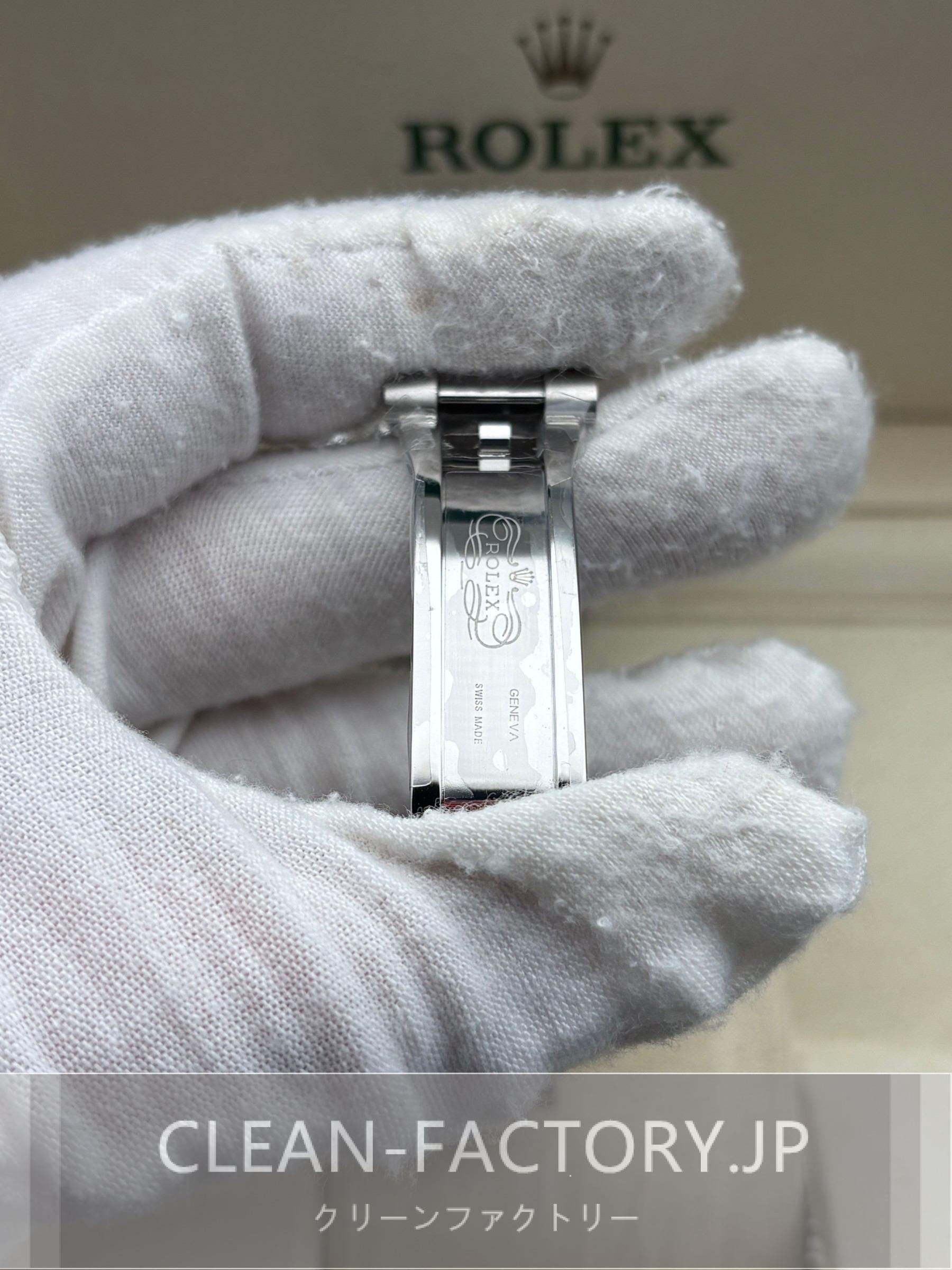ケース:40mmのオイスターケースはロレックスのオイスタースチールにマッチし、ソリッドな904Lステンレススチールのモノブロック構造の上に18kプラチナコーティングを5層施して作られています。スクリュー式のケースバックとねじ込み式リューズを備え、Rehautリングには「ROLEX ROLEX」のレーザー刻印が施されてい ます。寸法はオリジナルのロレックスとまったく同じです。
