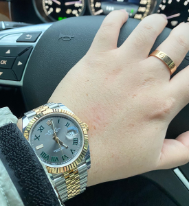 文字盤:スレートグレーの文字盤にグリーンのローマンマーカーがエレガントに配されており、印象的なコントラストを生み出しています。アワーマーカーと針には明るい夜光スーパールミノバブルー発光蓄光コーティングがあり、夜間には9時間まで均一に発光できます。どんな場所でも高い視認性と洗練された外観を確保できます。デイトのフォントとサイズも含み、レザーによる精度なテキスト、プリント、刻印が正規品とそっくりです。アワーマーカーと針には18 K イエローゴールドコーティング加工を施さており、色落ちしないことを確保できます。