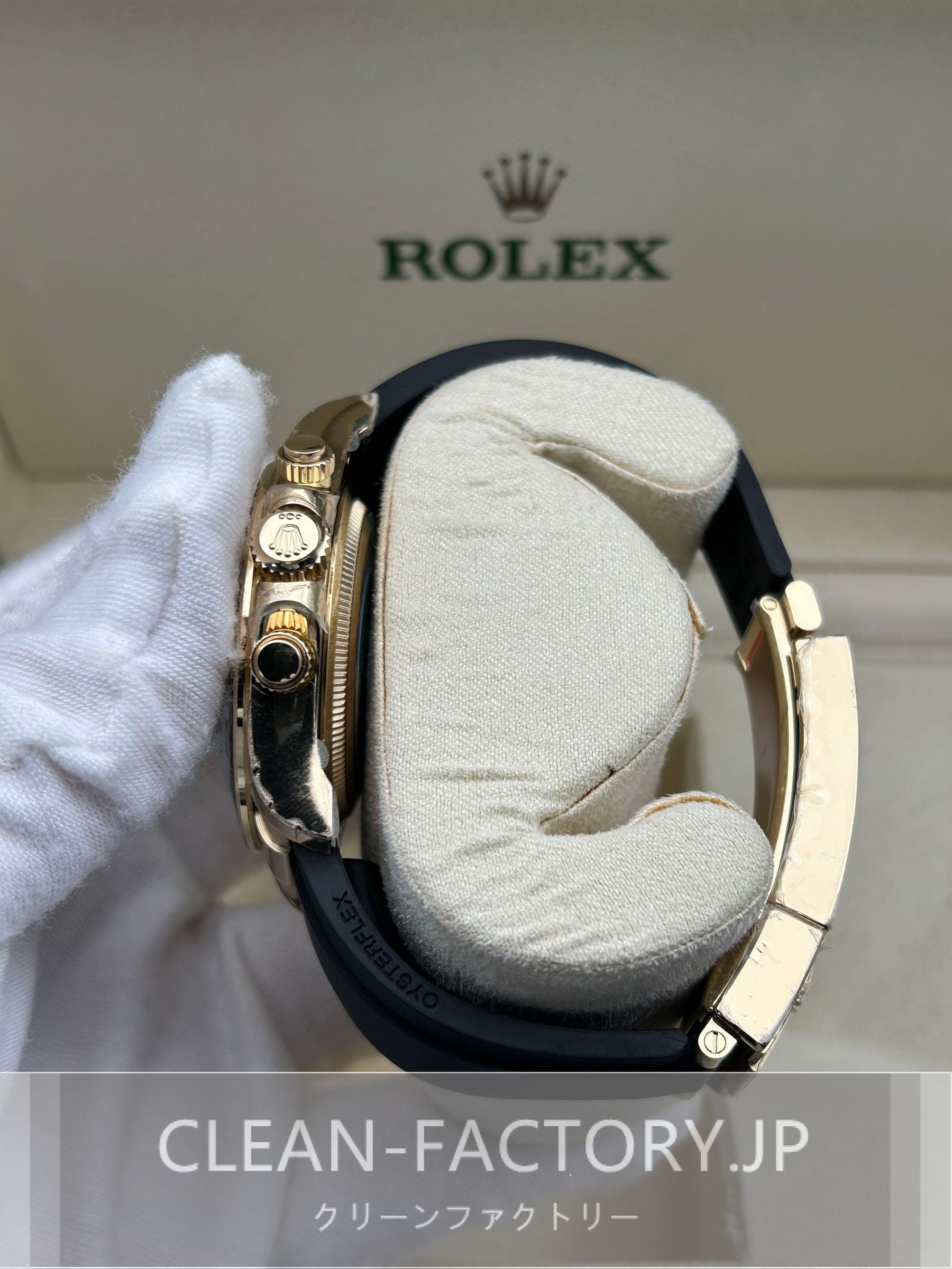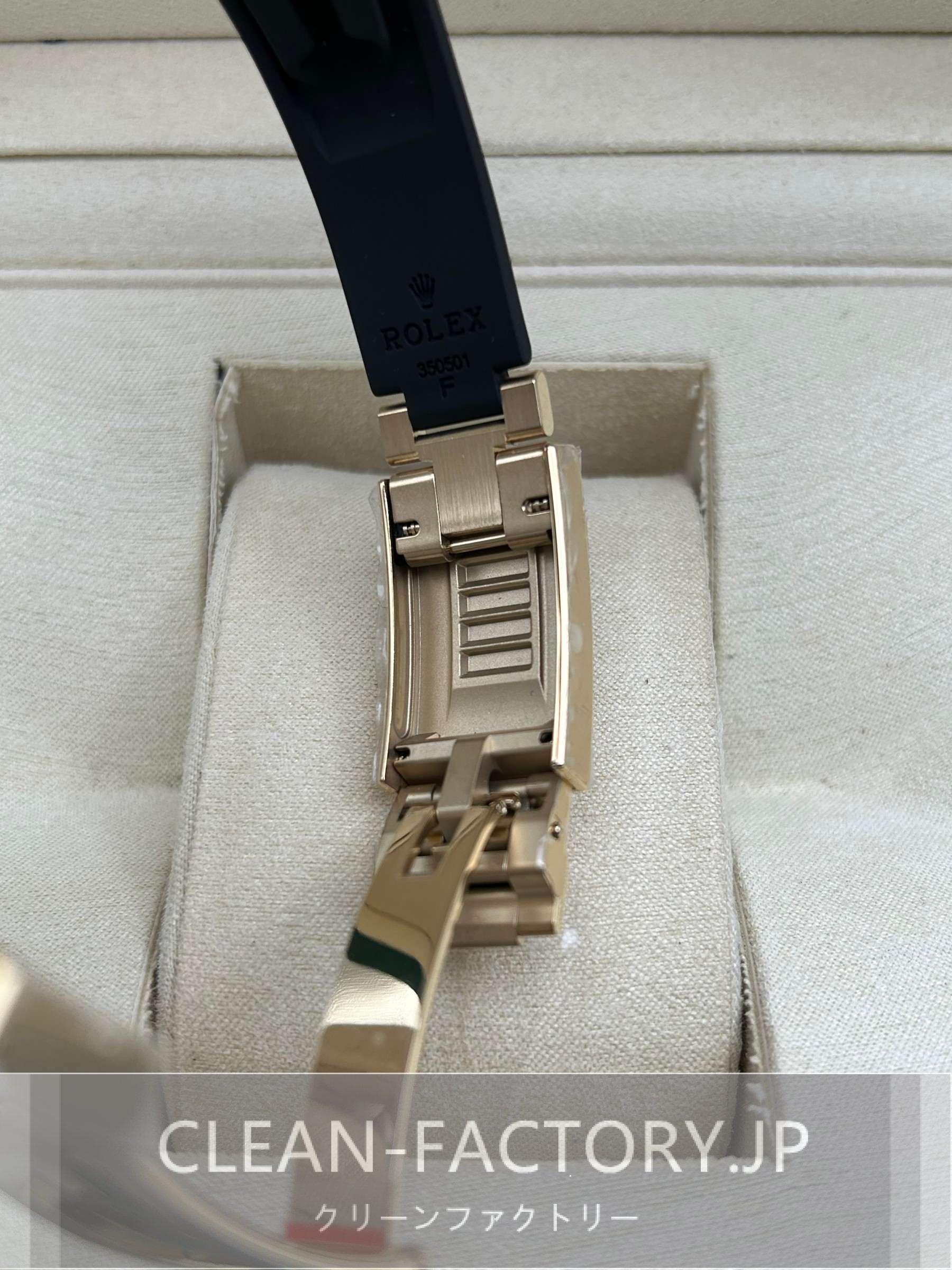 ベルト:メタルブレードの芯にブラックのエラストマーをオーバーモールドされた高性能のラバー製オイスターフレックス・ブレスレットは耐久性と快適性を備えております。ベルトには18kホワイトゴールドコーティングされたソリッドな904Lステンレススチールによって作り出された折畳式オイスター安全スクラップを備えており、確実なフィット感を確保しております。