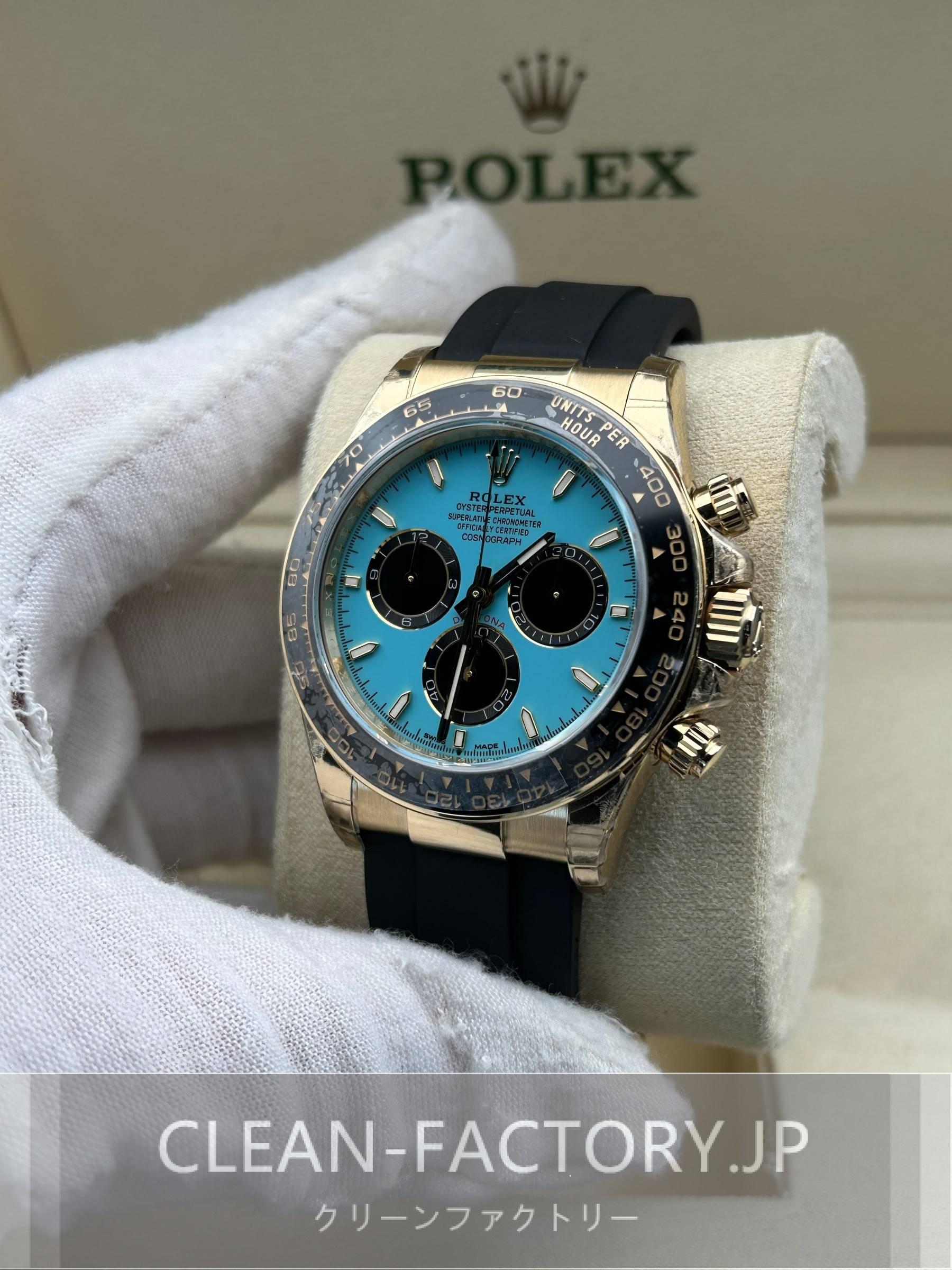 文字盤:ターコイズブルーの文字盤は、コレクターの間では「ティファニーブルー」とも呼ばれ、鮮やかながら上品なトーンが際立っています。光沢のある表面はモダンで若々しい印象を与え、大胆な色合いが主張しすぎないワントプレゼンスを演出。アワーマーカーと針にはスーパールミノバブルー蓄光コーティングされており、夜闇に9時間ぐらい視認性を確保できます。クリーンファクトリーはあらゆるレーザーテキスト、プリント、刻印の精度がロレックス正規品と見分けがつけないことを確保しております。アワーマーカーと針に施された18Kゴールドコーティングは時計の高級感を高めながら、色褪せすることを防止しております。