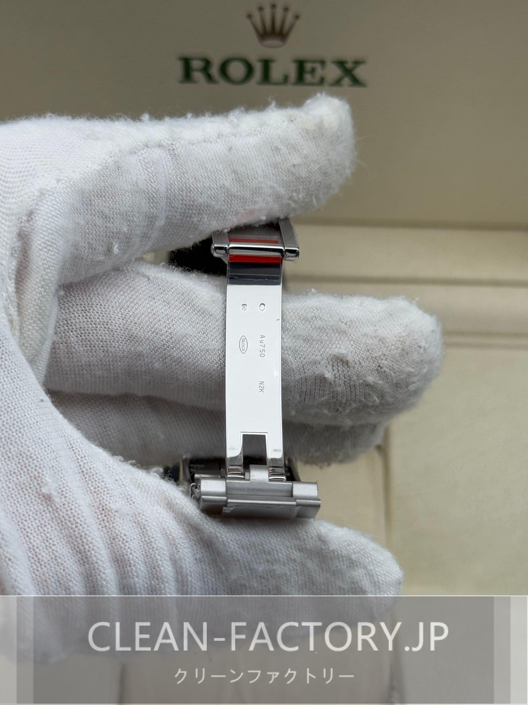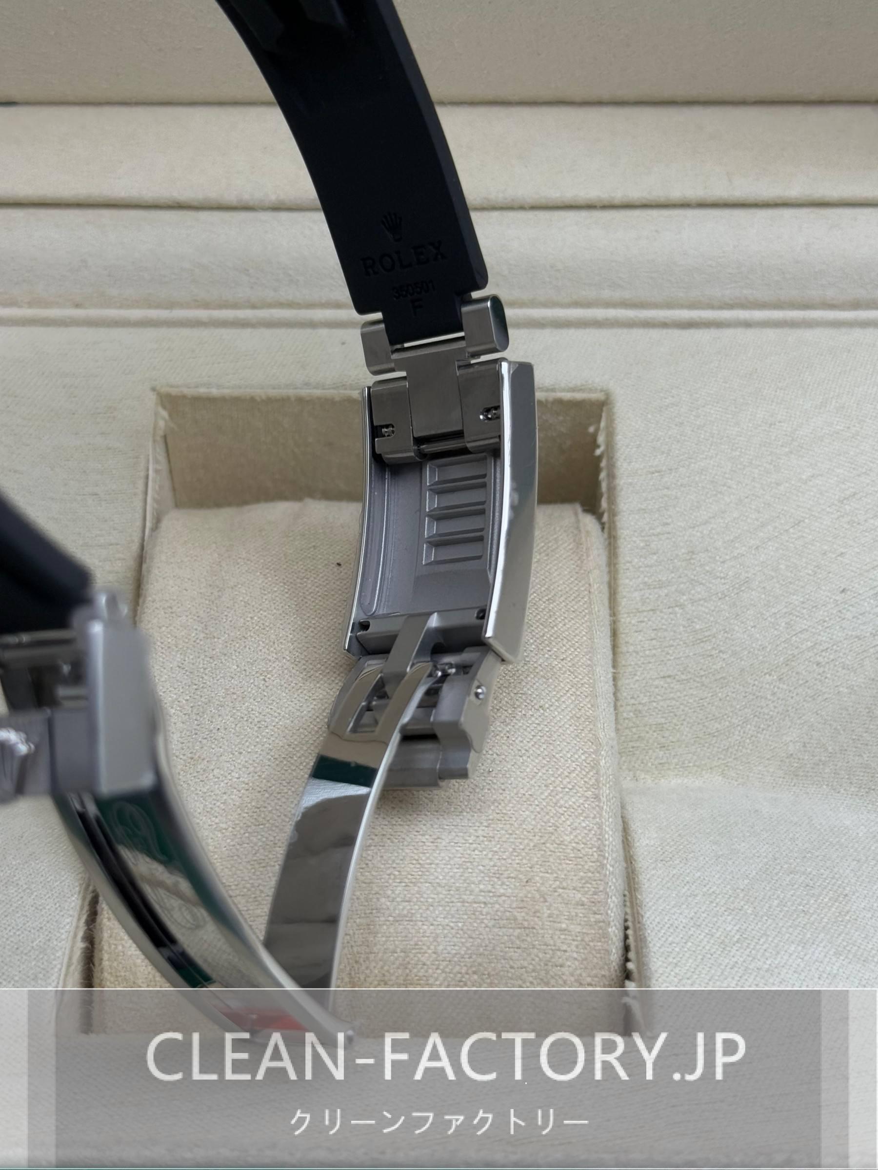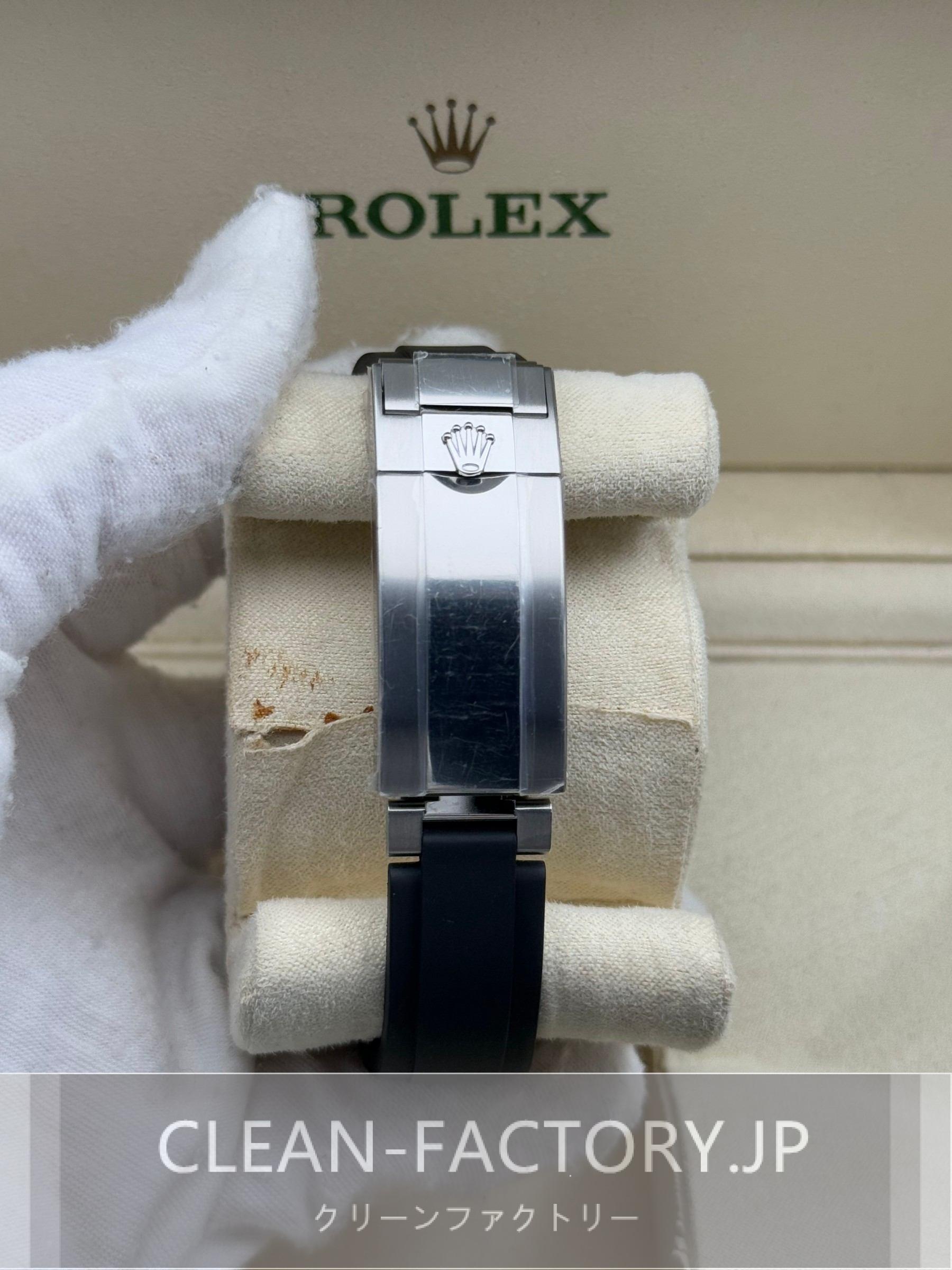 ベルト:メタルブレードの芯にブラックのエラストマーをオーバーモールドされた高性能のラバー製オイスターフレックス・ブレスレットは耐久性と快適性を備えております。ベルトには18kホワイトゴールドコーティングされたソリッドな904Lステンレススチールによって作り出された折畳式オイスター安全スクラップを備えており、確実なフィット感を確保しております。