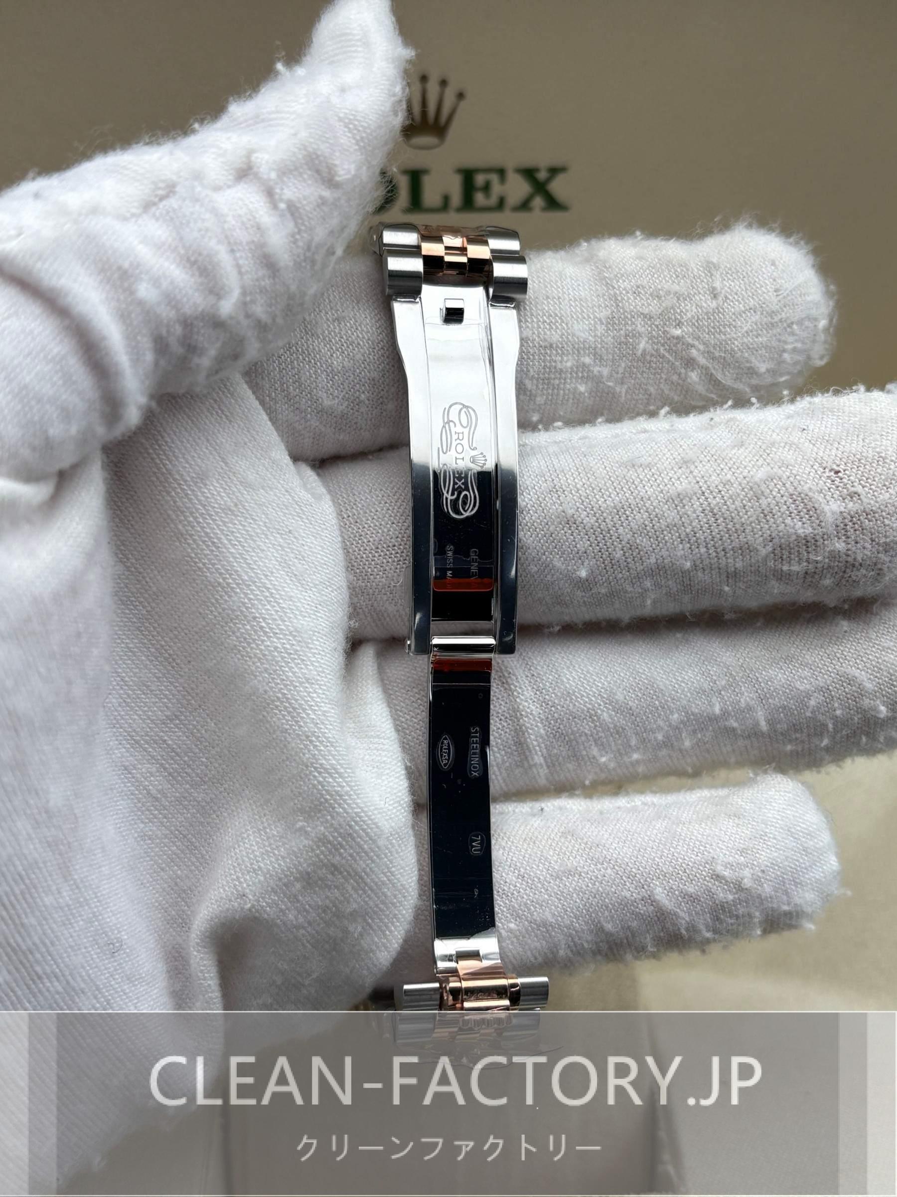 ベルト:ジュビリーブレスレットデザインベルトは、904Lグレードステンレススチールで作り出されたツートン5ピースリンクです。 DLCスクラッチプロティングコーティングを施されており、ミドルリンクには18Kローズゴールドコーティングを施されております。しっかりとしたネジ山で簡単にベルト調整が可能です。また、コンシールド・クラウン・クラスプを備え、素早く快適にベルトを装​​着できることを確保しています。