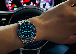 文字盤:ブラックラッカー文字盤には明るい夜光スーパールミノバブルー発光蓄光加工に施されたアワーマーカーと針を備え、優れた視認性を持っています。まっ闇な環境に最たる9時間まで均一的に発光できます。レザーによる精度あるテキスト、プリント、刻印から、カレンダーデイトのフォントとサイズまでも正規品とそっくりです。GMTモデル象徴的な先端の矢印を持っているブルーGMT針は24時間ごとに1回を回転し、アワーマーカーと針には18Kゴールドコーティングを施されています。