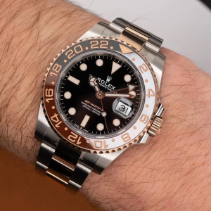 ベゼル:24時間回転式ベゼルには、24クリックの両方向回転式24時間目盛付きルートビア・セラクロム・セラミック・インサートを備えています。数字と目盛りが18Kローズゴールドでコーティングされたことにより、時計の魅力をさらに引き立てます。